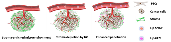 2)随后给予吉西他滨(GEM)负载脂质体(Lip-GEM),由于NO治疗导致间质破坏,Lip-GEM的瘤内穿透性得到增强,从而显著提高了药物的输送效率。